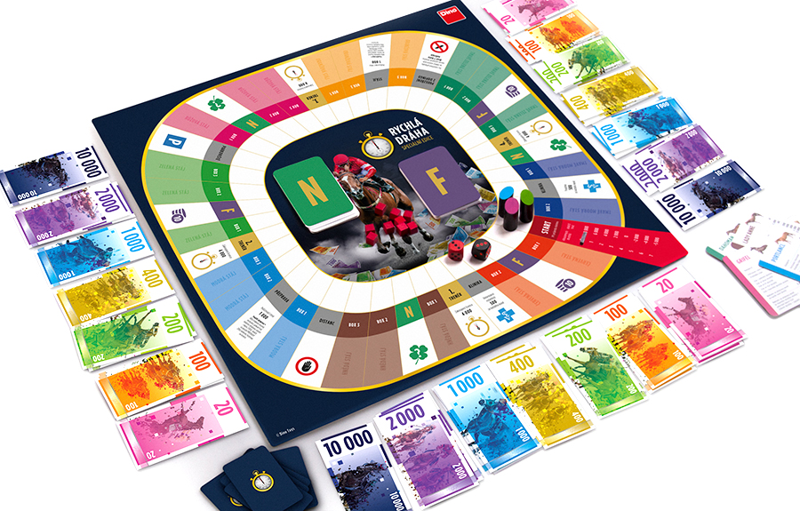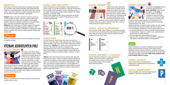 grafický návrh obalu, herního plánu, herních karet, dostihových korun, žetonů a návodu.